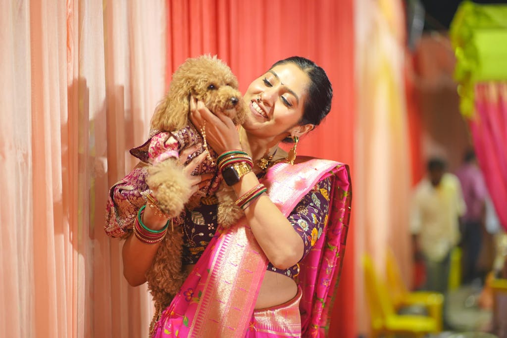 This Gulabi Banarasi saree for dogs and cats is made of traditional banarasi brocade and comes in beautiful pop colors. It's easy to wear and perfect for special occasions, adding a touch of cultural elegance to your pet's appearance.