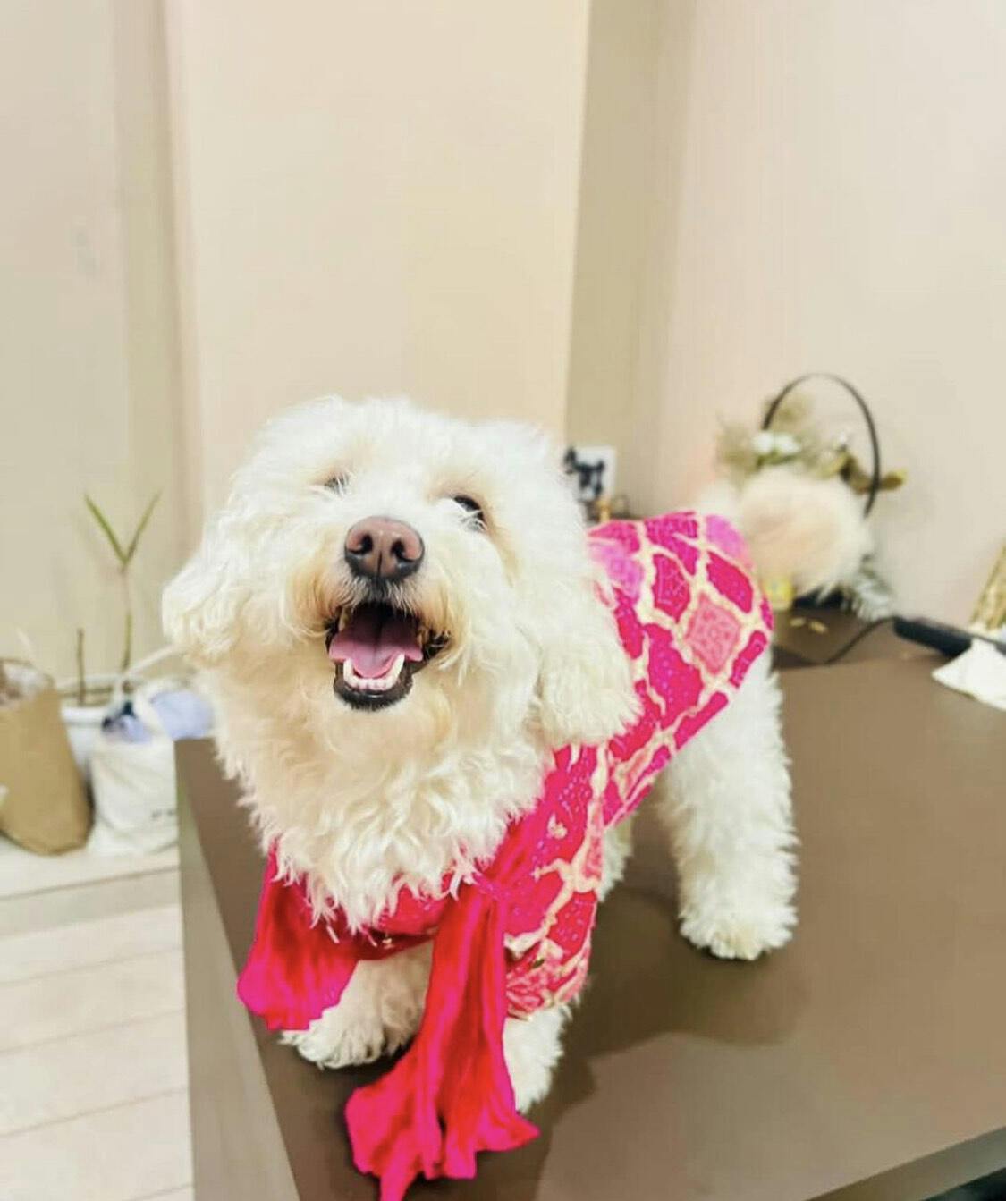 Make your pet stand out at your special day with this lovely pink dog kurta. Perfect for weddings and festive occasions, this dog kurta features an all-over print with sequin work, along with fabric loops for a dupatta and easy-to-open gold buttons on the placket. Let your furry friend join in on the celebration in style.